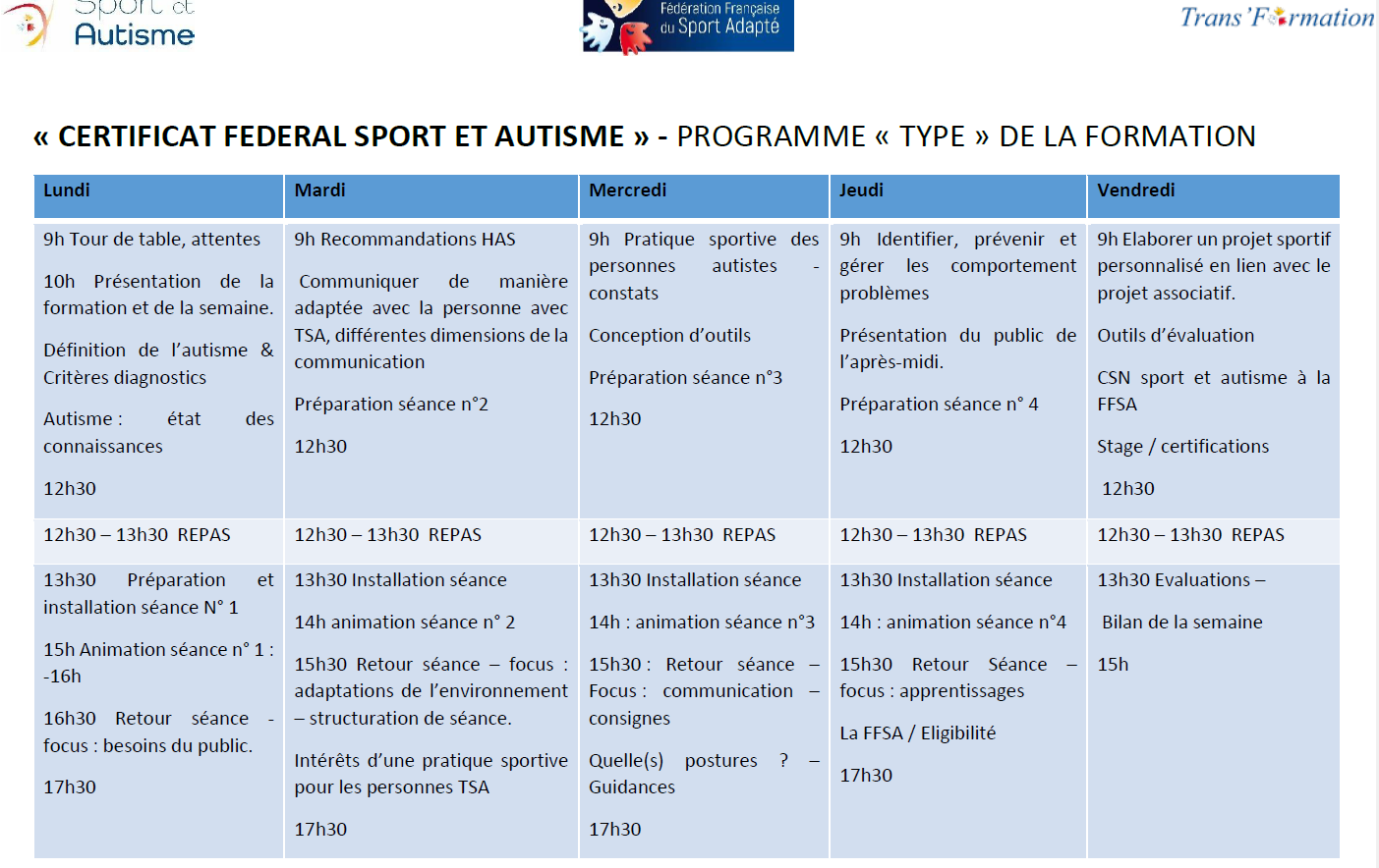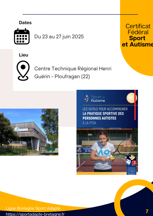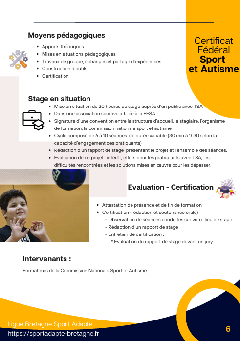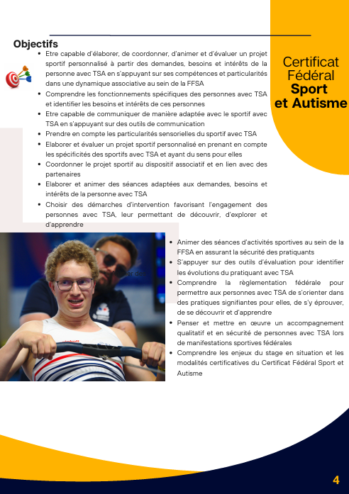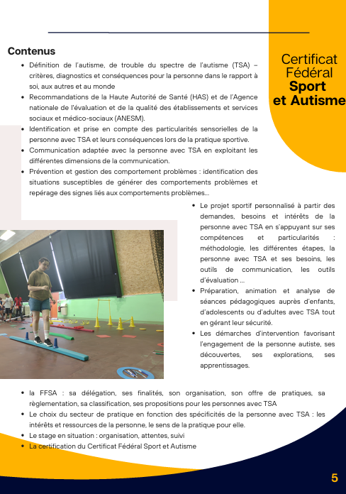 📚 Ce certificat est proposé par la commission nationale « Sport et autisme » de la Fédération Française du Sport Adapté. Il permet à des professionnels déjà qualifiés dans le champ des métiers de l’animation et du sport, ayant des prérogatives auprès de tout public (personnes en situation de handicap comprises) d’acquérir une qualification complémentaire leur reconnaissant des compétences d’intervention en sécurité auprès des personnes ayant un trouble du spectre de l’autisme dans le champ fédéral. La formation permet notamment d’acquérir une meilleure compréhension du fonctionnement autistique, d’appréhender des moyens de communication adaptés, de prendre en compte les particularités sensorielles de ces personnes.